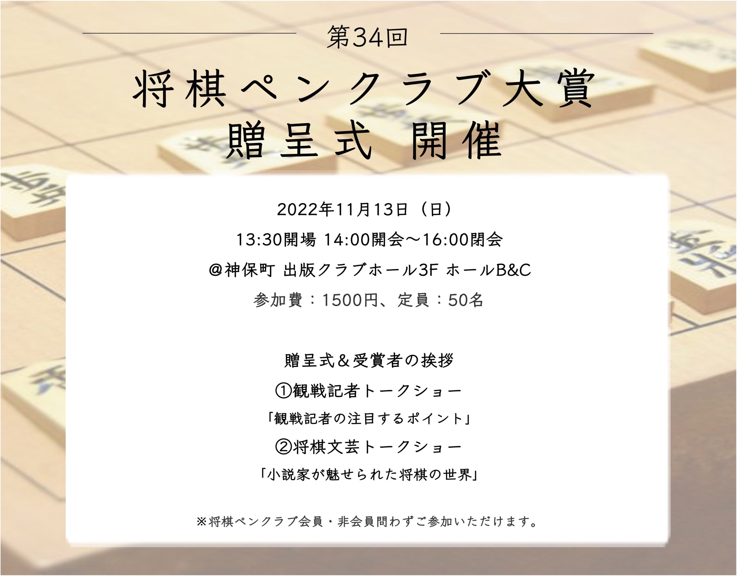 11月7日(日) 13:00 将棋ペンクラブ大賞贈呈式&受賞者トークショーをインターネット配信します
