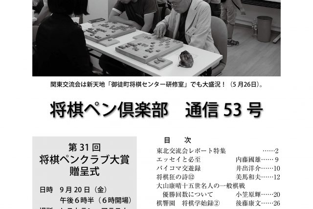 会報将棋ペン倶楽部 通信 第53号 2019年・夏 目次東北交流会レポート特集2大賞基金にご協力のお願い8エッセイと必至内藤國雄9パイコマ交遊録井出洋介10将棋狂の詩⑫美馬和夫12将棋川柳募集19大山康晴十五世名人の一般棋戦優勝回数について小笠原輝20...会報