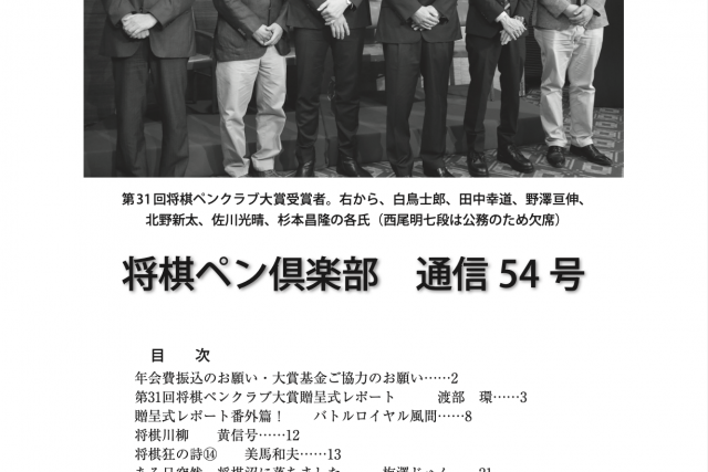 会報将棋ペン倶楽部 通信 第54号 2019年・冬 目次年会費振込のお願い・大賞基金ご協力のお願い2第31回将棋ペンクラブ大賞贈呈式レポート渡部 環3[広告]株式会社コーセー・アカシヤ書店7贈呈式レポート番外篇!バトルロイヤル風間8将棋川柳黄信号12将...会報