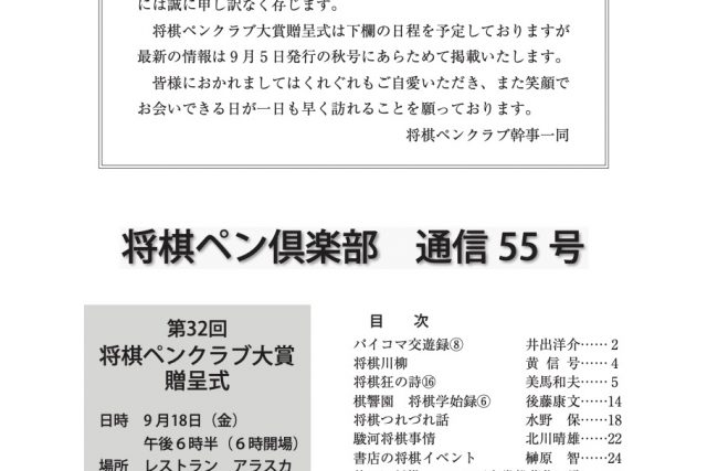 会報将棋ペン倶楽部 通信 第55号 2020年・夏 目次パイコマ交遊録8井出洋介2将棋川柳黄信号4将棋狂の詩16美馬和夫5原稿募集13棋響園 将棋学始録6後藤康文14会員募集16広告募集17将棋つれづれ話水野 保18将棋川柳募集20[広告]『駒の精』・...会報