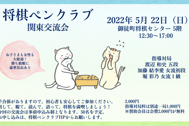 交流会将棋ペンクラブ関東交流会のご案内(2022年) #2 2022年5月22日(日)、将棋ペンクラブでは3年ぶりに「関東交流会」を開催することになりました!ウィズコロナの対策を施しながら参加者の交流ができるイベントを計画いたしますので、ふるってご参加ください...交流会交流会のご案内