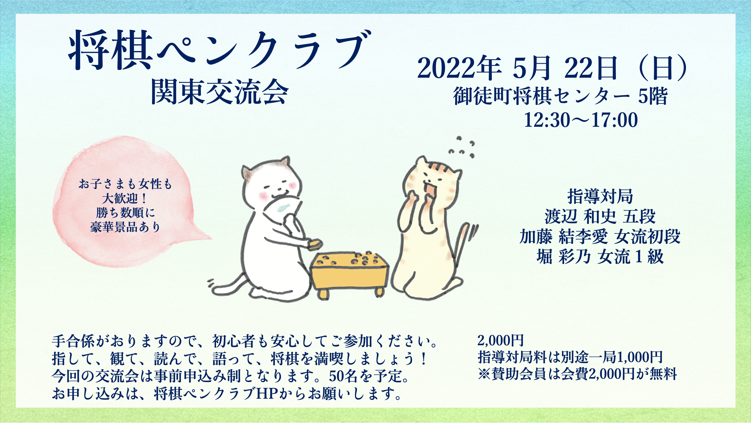 【速報】将棋ペンクラブ関東交流会のご案内(2022年) X Facebook LINE コピー 2022年04月20日関東交流会は2022年5月22日(日) 午後に東京、御徒町で開催することを決定いたしました。詳細は2022年4月24日(日)に当HPでお知らせいたします。